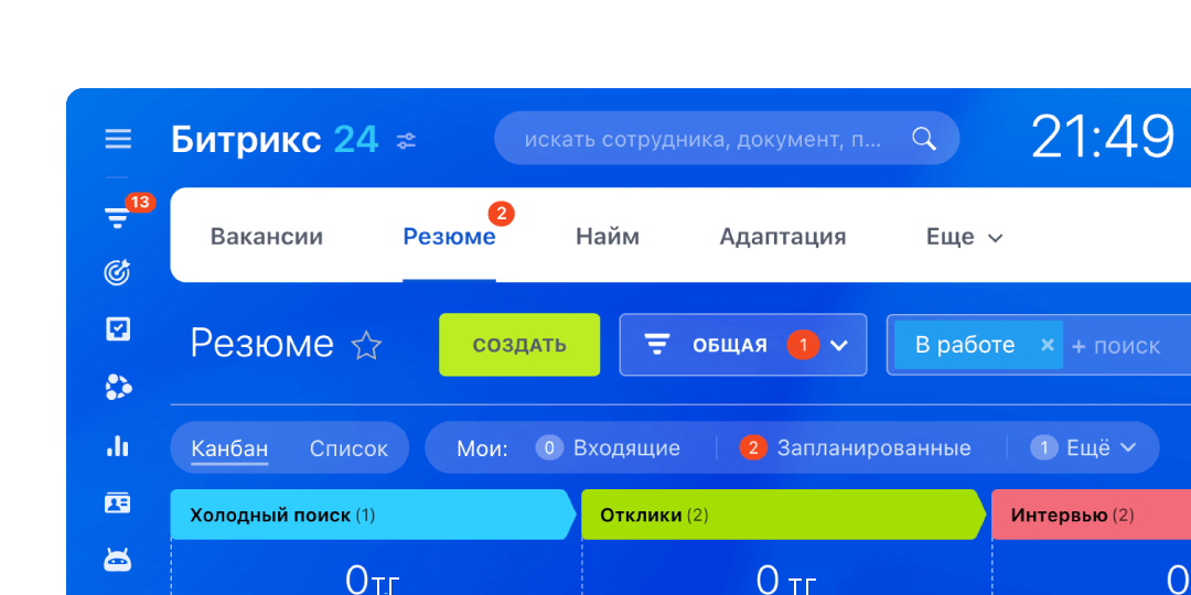 Весь процесс найма — от поиска соискателя до его принятия на работу — на одном экране. Всё идёт по заданному алгоритму со своими этапами и заданиями.