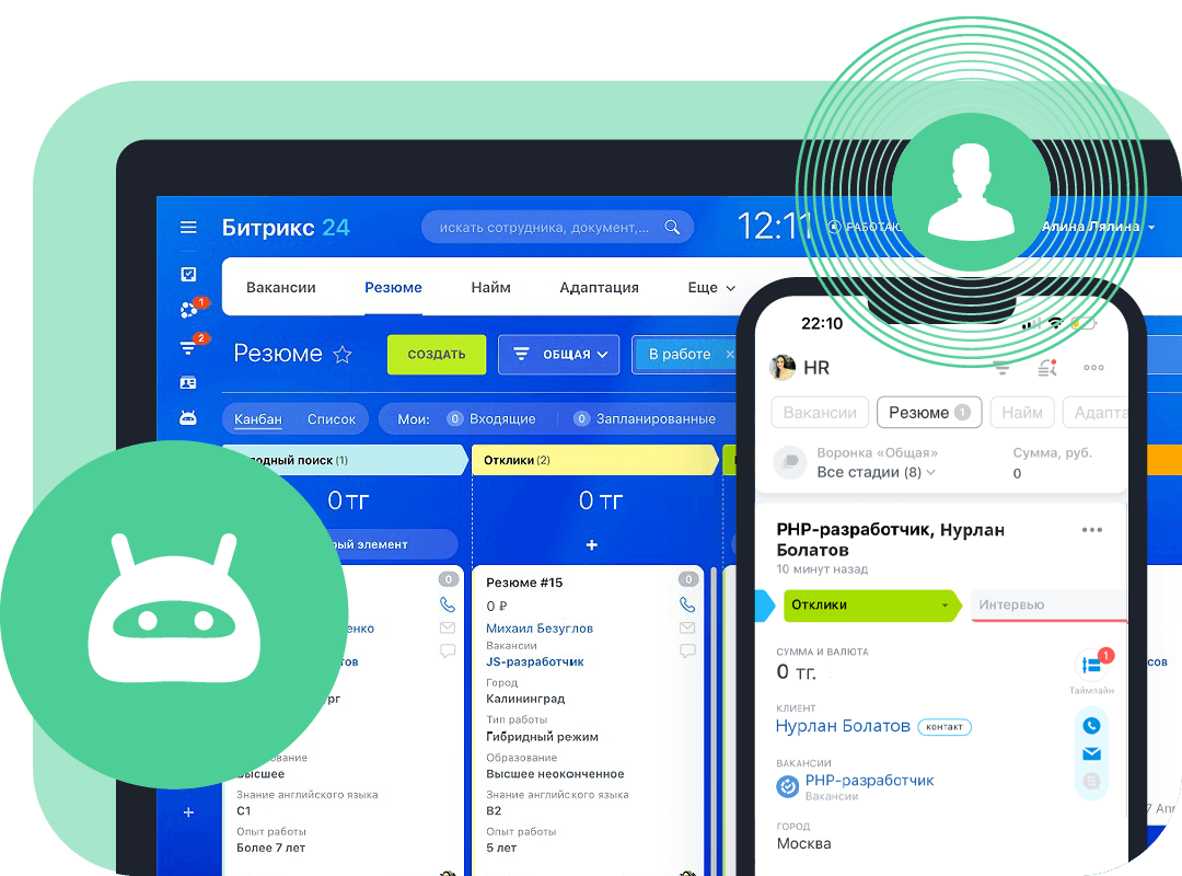 Рутинные операции роботизированы: резюме автоматом попадают в работу, система отправляет рекрутёру отбивки, тут же генерируются нужные документы и отправляются кандидатам.